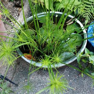 ミニパピルスの花、まん丸でかわいい 他のスイレン、シダ🪴等の緑💚が眩しい✨✨🌿