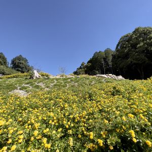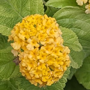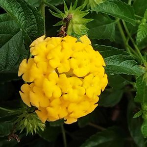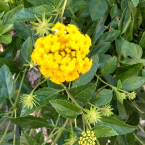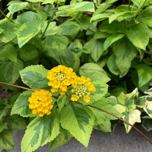 初めましてのお花🌼 斑入りの葉っぱが可愛い キバナランタナというお花が 植物公園に咲いていました😊