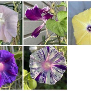 今朝の朝顔 咲き方色々 丸咲 桔梗咲 釆咲 石畳咲 急に雨が降り始め急いでpic撮りました。
