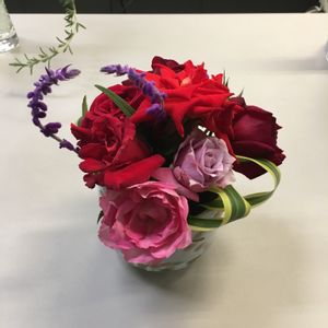 受付の花。アレンジの残り花で。 ローズマリーとなんていう花かわからないけど、かわいいのと。 ガラスの花瓶にゼリーをいれてます。