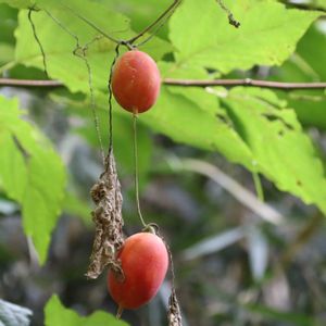 カラスウリの実 (ウリ科) 今日のお花(実) 花は夜間だけ開き、秋枯れが始まった雑木林の林縁などでよく目立つ朱色の果実をつけます。蔓性の多年草。 この朱色の果実は、冬になっても結構目立つようで、鳥さんや獣たちにあまり人気がないみたい😅 生田緑地の岡本太郎美術館脇でパチリ📷