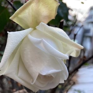 剪定の時期なのに、元気に咲き続けるつるバラの新雪。 もったいなくて、どうしたものか悩みます。