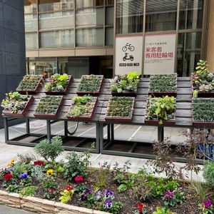 園芸店ではなく、病院です(^.^) 建物ぐるり、花壇とベンチ。 写真は自転車置き場の目隠し。 花に囲まれた一階のカフェも 開放的で気持ちいいんです♪