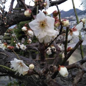 おはようございます*˙ᵕ˙* 福岡のお友だちが、お庭の 白梅の画像、送ってくれました💕 昨日投稿の紅梅とは違い 枝ぶりが太くて、ゴツゴツしてますね😊 遠くに見える山、低山ですがハイキングしてた懐かしい山です。