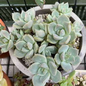 天竺 6センチの素焼き鉢に植え付けてある小振り苗 なんだか可愛くて最近のお気に入りです☺️ ⬆️株元には子株モリモリ😊 ⬇️でもこちら側から見る方が可愛くて好き💕 どっちから撮った写真を載せようか悩み、選べずに2枚ともpicする事にしました😁 みどりんだしエケベリアのような派手さはないけど、魅力的な多肉さんです😊