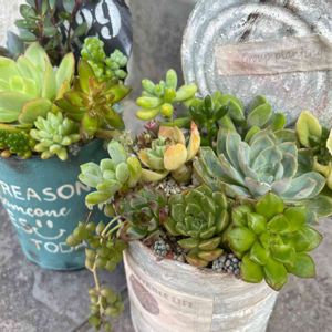 子持ち蓮華 リメ缶から溢れんばかりでいい感じ〜☺️ 昨日の夕方水やり、今日は曇っていたので多肉棚の2段目、3段目の子達を庭に広げておきました。 少し雨がパラついたり、日が差す時間もあったけど、いつもに比べたら涼しいのでそのまま放置。 明日も曇り予報なので夜もそのままにしてます。 程よい日光浴と鉢乾かしの一石二鳥作戦のつもり😁 明日乾いてるといいなー😊