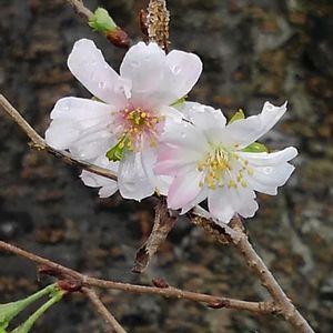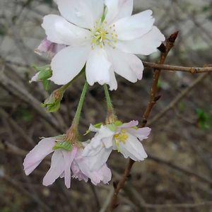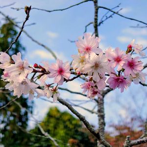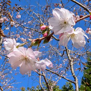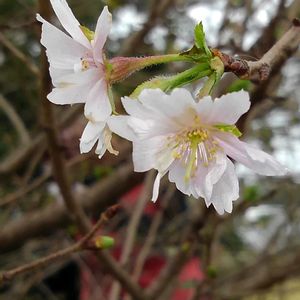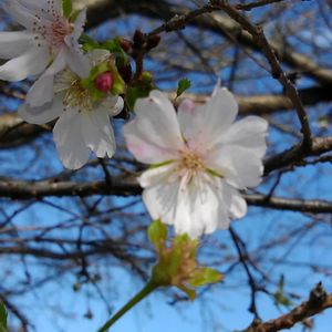 ジュウガツザクラ(十月桜) 豊橋総合動植物公園の植物公園エリアで一番に目に入りました ボチボチの花付きではありますが やっぱりサクラは心が和みます マメザクラとエドヒガンの交雑種であるコヒガンザクラを原種として江戸末期に作られた園芸品種 春と 秋から冬にかけての二度開花する二季咲きが特徴です