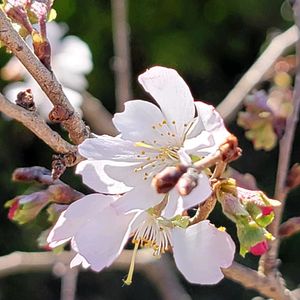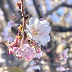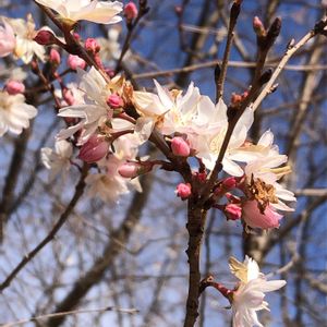 ジュウガツザクラ バラ科サクラ属 落葉小高木 開花期 10/20〜1/10頃 3/20〜4/10頃の二度咲き ジュウガツザクラは全体の蕾の3分の1が10月頃に咲き、残りの3分の2は春に咲く。 🏷️土曜はお空の発表会 に参加させていただきます。