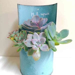 雷混じりの凄い土砂降りです🌦️ 辛うじて、この子を避難ε=(ノ゚Д゚)ノ 和歌山、有田で開催された、クラシックカーのイベントに、出展してみえたお花屋さんで購入🚖🚎🚘 この缶の色と多肉植物達の色のコラボに、一目惚れでした💕