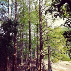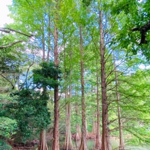お出かけ先から♪ ラクウショウの木 初めて見ました👀 水中から生えているものもあるそうで和名はヌマスギとも言われます 幹の下のほうは広がって屏風状になり、周囲の地面から出ているのは呼吸根らしいです もともとの生育地はアメリカ南東部の湿地だそうです🇺🇸 まるで異国のような雰囲気でした🎶