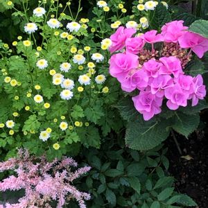 おはようございます 紫陽花フェアリーアイもだいぶ色づいてきました 夏菊(マトリカリア)とアスチルベと重なり合うギュウギュウな一画です(*'▽'*)
