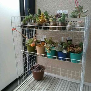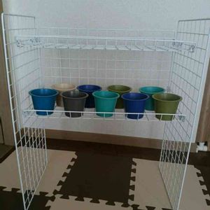 また100均グッズで棚作りました💨 見た目は良くないけど、安く作れれば問題ない👍 こだわりポイントは、棚板として使ってるネットの手前側を折り曲げて立たせてる点✨ こうすることで、折り曲げない状態だより強度が上がって、重さで真ん中あたりがたわみにくくなってます⤴ それだけでなく、立ち上がり部分が滑り止めにもなるので一石二鳥💨 もう一つは、外に置くので結束バンドだと紫外線での劣化が早く、突然ちぎれて棚が崩壊する危険があるので、ワイヤーネット用の連結パーツを使用しました💨 今回の材料は100円ネット3枚、150円ネット2枚(両サイドの高さが欲しかったので)、連結パーツ一個で700円⤴ 実際作ってみて少しぐらつくので、下段の背面にもう1枚ネットを付けて強度を出したいので、最終的には900円くらいかな😁 すのこで作る方が安くできるけど、すのこだと板の幅のぶん陰が出来やすいので、ワイヤーネットで作ってみました✨