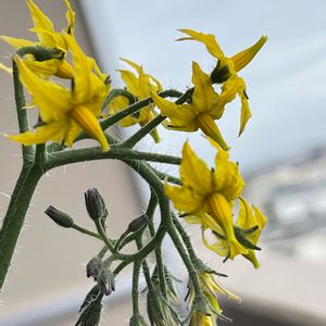 室内管理の、食べた種から育ててる、ミニトマト🍅 前回投稿の時から小さな蕾があったのですが、1週間が過ぎ蕾が開き始めました😊