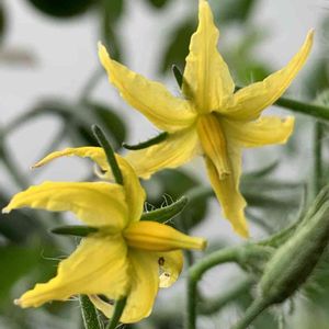ミニトマトの花🌼🍅🌼 上のお花花びらが密集してて、 八重咲き⁇…そんなの聞いた事ないわね🤔 アップで撮ってみたら… あら〜🤩コレ2つ花がついてるよ‼️ ミニトマトの双子ちゃんかな? どんな実が出来るか、楽しみ〜💗🎶