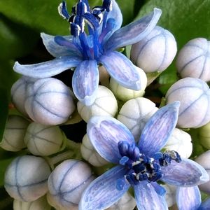 今日のお花 アジサイ 碧(あお)の瞳(ひとみ)が咲きだしました(✿ ♡‿♡) GS始めた時この漢字読めなかった(^^) 蕾の時はきみどり色(5月末pic) 葉っぱは常緑🌿。秋に瑠璃色の実🪅