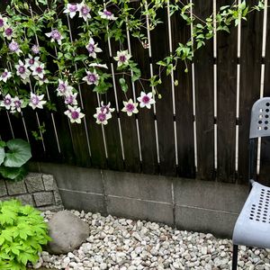 クレマチス テッセン この時期の庭の主役は彼女たちです 東の植栽エリアからうねるようにフェンスへ広がる躍動感 しなやかさの中に強さを持ち、雅な花たちは柔らかく風に乗る まさにこんな姿をイメージしていました、の更に上ゆく仕上がりに毎年惚れ直す🥰 #水無月の庭 #庭は一幅の絵画