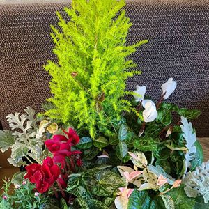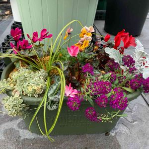 寄せ植え② 先程の投稿の後、すぐ投稿するはずが こたつに入って寝落ちしました笑 11月半ばにお迎えした見切り品になっていたシクラメン3種を使いたくて。 こちらは赤系を多め。 シクラメンの状態があまりよろしくないけど、こちらも大丈夫なんだろうか? いつも私は成長した時の事を考えてかなりスカスカの状態で出来上がりますが、 今回はいつもより埋めてみました😊