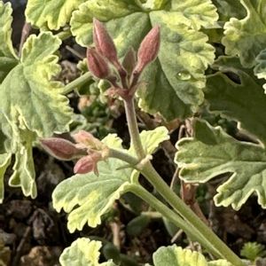 ナツメグゼラニウム💚マーブルレモン 見切りコーナー出身ですが無事に夏と冬を越えました🌸 斑入りの葉っぱだけでも可愛いのに薄ピンクの小花が咲くと更に可愛いのです♪待ち遠しい!😆✨ 🏷️金曜日の蕾たち
