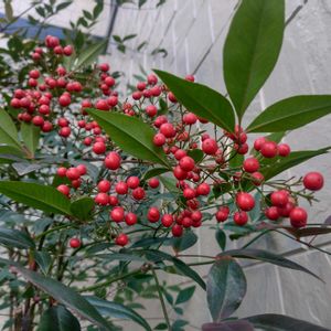 南天の赤い実が玄関でお客様をお迎えします 難を転じるといわれ(難転)と縁起の良いものと言われ玄関などに飾られる事が多いらしい