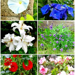 友人宅のお庭です 朝顔❁紫陽花 八重のカサブランカ❁ジャスミン 薔薇❁石楠花 色とりどりで賑やかです 最近の私の投稿がみどりんだったので(๑• •๑)