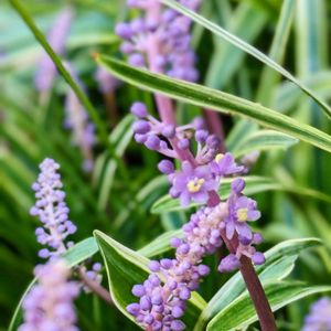 斑入りヤブラン 今年も玄関横の紫陽花の下に青紫色の藪蘭が咲き出しました🥰