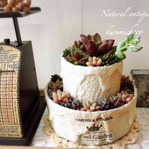 Jewel Gardenさんのケーキ缶に多肉の寄せ植えをしました😊💕 垂れ具合が可愛い缶ですʚïɞ.•*¨*•.¸¸♬