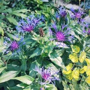①②セントーレア モンタナ アメジスト ドリーム(Centaurea montana)。セントーレア・スカビオサ。2022年秋に種まきして3年目で咲きました ③写真を撮っていたら、クマバチが飛んできて蜜をがっつり飲んでいるところをパシャリ。ちょっと綺麗な羽じゃない。見たことがなかったので、Google先生に尋ねたら外来種のタイワンタケクマバチでした。 セントーレアは蜜源植物?