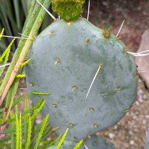 皆様おはようございます。 左の先端に小さな新しいウチワ? 子供が出てきた! ダイソーでひっくり返っていて、可哀想と思って迎えた。しかし物が落ちて欠けた。波瀾万丈なサボテン。 愛着人一倍です。 元気に育って!