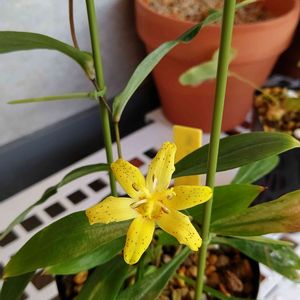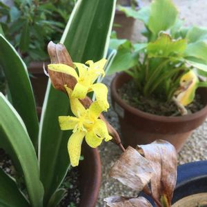 庭に咲く花 新天地で咲いた黄花ホトトギス 葉は茶色く枯れたよう でも綺麗に花を咲かせてくれました。 球根を植えて4年くらい 「待ってましたよ。」 嬉しい出会いです😊