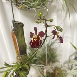 年末にお迎えしたトルムニアが咲きました🌼 スーパーブラウンというだけあって茶色い子🤎 香りはないけどシックで大人っぽい子です✨✨ 2〜3枚目 年末年始を楽しませてくれた2株🌸 オンシジュームは香りがすごく良いので他の香り付きの子が開花しても負けちゃう程でした🩷 夏咲きのデンドロビウムは晩秋に咲いたのに未だ健在! そろそろお花も終わりだと思うので投稿させて頂きましたが、また夏頃花芽がつくといいなぁ🤍 4枚目 100均材料のみでコサージュ作りました🌸 多分1/4くらいの値段で作れたので大満足😊 半日くらいかかったけど😂