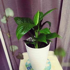 ハートカズラ越しの«スパティフィラム» DAISO産の大きい観葉植物より。 下の方に新芽が一杯あるので 今後が楽しみ🎶