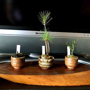 ミニミニ盆栽を蚤の市で買った陶器と謎の木の板に乗せたら良い感じに笑