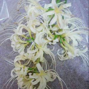 いただき物の白い彼岸花。 🐱の髭のようにシュッと伸びてカールしてる😊 キレイで可愛い💓 花言葉は『また会う日まで👋』『思うはあなた一人😚』ですって~❇