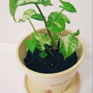 シンゴニウムの植え替え✨ ミニオンズのプラカップで育てていたけど、底に根っ子が見えたので、古い痛んだ根っ子を落とし、ジョージの鉢へお引越し😊