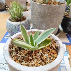 アガベ????? 前に子供の受験で待ってる間、園芸店でも探して時間を潰そうとウロウロ。 見つけた園芸店で状態はあまり良くなかったんですが、その当時斑入りを見たことなかったんで思わず買っちゃったんです😆 悪い葉を取ってだいぶん整っできたかな😊 良かった良かった(*^_^*)