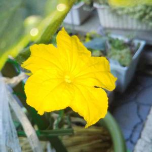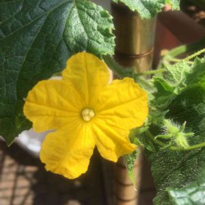おはようございます😃 種から蒔き、 やっと待望のきゅうりのお花! 一輪咲きました😄🌸 ✨嬉しい☺️🎊