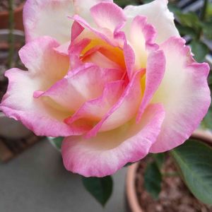 鉢植えのバラ プリンセスドゥモナコが咲いています。白地にピンクの覆輪の美しい花型のバラです。一番のお気に入りのバラです。