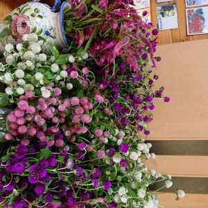 今日のお花✨ センニチコウ✨ ①②③④ 我が家の花壇や花畑で育ったお花です😊 大好きだから、毎年育てています😊✨😊 ⑤鹿屋市、ダマスクの風にて カフェ内の、見事なドライフラワーには感動です✨😂✨