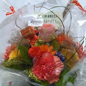 本日😊 結婚記念日です😊 朝、キッチンに来たら 素敵なアレンジメント✨ お気に入りのフラワーショップさんに、秋をイメージした感じで😌と お願いしてくれたそうです😊 私の大好きなオレンジのお花でいっぱい😊😊😊 今日は嬉しい1日です❤️