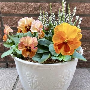 寄せ植え♡ 右の大きなお花は パンジーオレンジスライスさん* 夕陽色でとても綺麗🧡 左のちょっと小ぶりは フリル咲きパンジーさん* 上2枚の花弁は写真より色が薄くてベージュ寄り♡ 後ろのカルーナさんは白で清楚です🤍✨ 春になったら鉢増しが必要になるくらい育って欲しいです😊