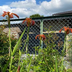 こんにちは😃 ただいま26℃朝の雨が上がって、一気に気温が上昇、暑いー😅 畑のルイジアナアイリスが咲いてきました🤎🧡 もう夏空🌤😥