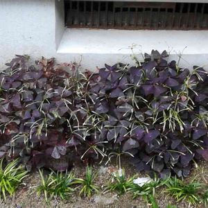 奥の紫色の植物です。葉の形はハート型で三つ葉のクローバーの様に付いています。 お隣から頂いたのですが 名前が分からないそうです。どなたか教えて下さい。
