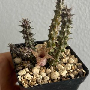毎日暑すぎてベランダの草たちもバテ気味。暑いの好きなガガイモたちでも溶けるヤツでできてます😅 Stapelianthus decaryi Huernia zebrina Echidonopsis malum