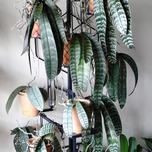 phal.schilleriana 葉の模様が美しい胡蝶蘭原種 シレリアナ✨🌿✨ コルク着生株の毎日水遣りが面倒になり、5月初旬にコルクにへばり付いた根っこを引っ剥がして素焼き鉢に植え替えました。 根を痛めたせいか約3ヶ月間ピタリと動きが止まっていましたが、8月になってやっと根と新葉が動き出しましたー🙌