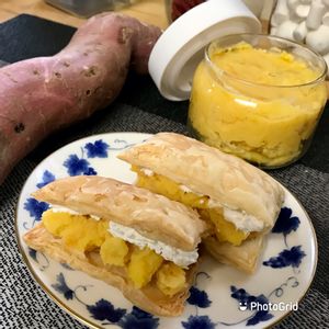 週末土曜15時の家cafe。 先日掘った安納🍠→からのペースト→からのミルフィーユ^_^。正の連鎖👍。