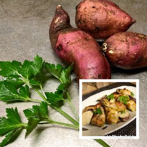 今夜の🍽は、タンドリーチキン🍗。甘い安納芋🍠との相性バッチリ👌、自家増殖ヨーグルトでお肉柔らか👍。彩りのイタリアンパセリ🌿は、これだけ寒くても全く元気で冬越し出来そう、いいハーブだね〜^_^。