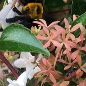 満開のアベリアです 新芽の赤 お花の白 葉っぱの緑 綺麗です! お客さまですよ! クマバチでしょうか!? 美味しい蜜ですか!? お食事中ですね! 全く気づきません アベリアの花にクマバチがよく来るようですので 気をつけましょう!