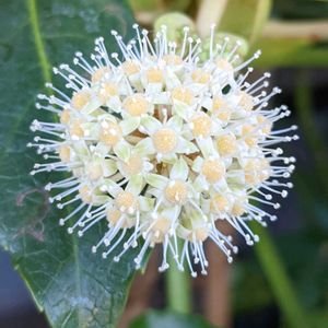 円錐形に咲くヤツデ(八つ手)の花は 地味に見えますが よく見るととっても綺麗です。 葉っぱは深い切れ込みがあり 人の手のように見えることから "大きな手でお客を招く"と言う意味合いで 古くからお店の入り口などに植えられた縁起物の植物です。 また 大きな葉が邪気の侵入を防ぐことで 魔除け 病除けとしても重宝してきたようです。🤗✨ 日本原産。 ウコギ科ヤツデ属の常緑低木。