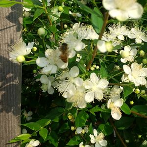 おはようございます🐸☔️ 昨日の朝のpicです。 玄関前に ほぼ満開のミルトス(銀梅花)の白い小花サンたちが ほんのり独特な香りを漂わせてくれています…☔️雨の日も 出入りの時に触ると、手に残る芳香が 癒しを与えてくれます…🌿この花の蜜を集めているミツバチサン🐝…どんな味の蜂蜜が できるのかなぁ~✨🍯✨笑