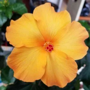 おはようございます。 オレンジ色のハイビスカス 今朝一つ咲いています。 元気を、もらえるお花です。 1日お休みしていましたが、また、咲いてくれました。 ありがとうの感謝として薄い液肥与えました。